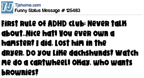 X First rule of ADHD club: Never talk about..Nice hat! You ever own a hamster? I did. Lost him in the dryer. Do you like dachshunds? Watch me do a cartwheel! Okay, who wants brownies?