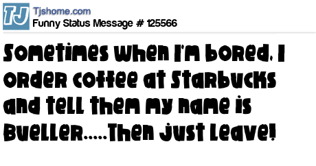 X says Sometimes when I'm bored, I order coffee at Starbucks and tell them my name is Bueller.....Then just leave!