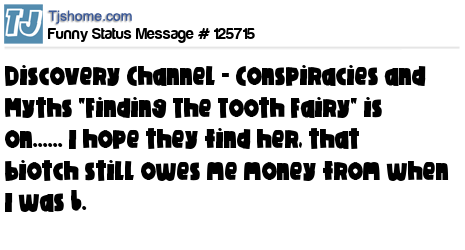 X Discovery Channel - Conspiracies and Myths "Finding The Tooth Fairy" is on...... I hope they find her, that biotch still owes me money from when I was 6.