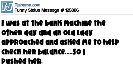 - # 6076 I was at a cash machine when an old lady walked up and asked me to help her check her balance. So I pushed her over.