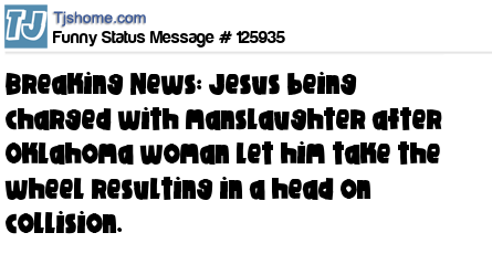 X is Breaking News: Jesus being charged with manslaughter after Oklahoma woman let him take the wheel resulting in a head on collision.