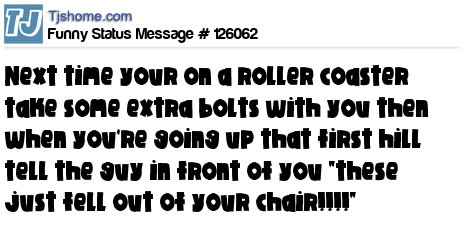 - # 97258 Next time you ride on a roller coaster, take some spare bolts with you and just as it starts to move, tap the person in front of you and say, "these just fell out of your seat." muhahahahaaa.,