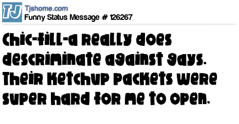 X  Chic-fill-a really does descriminate against gays. Their ketchup packets were super hard for me to open.