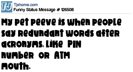 X is My pet peeve is when people say redundant words after acronyms, like “PIN number” or “ATM mouth.”