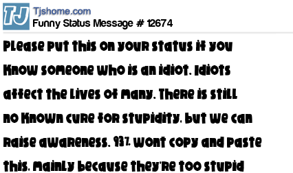 X Please put this on your status if you know someone who is an idiot. Idiots affect the lives of many. There is still no known cure for stupidity, but we can raise awareness. 93% wont copy and paste this, mainly because they're too stupid to copy and paste