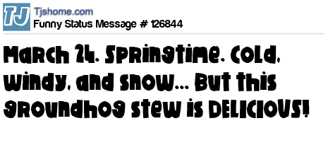 - # 163852 Tuesday is Groundhog Day, I'm very excited. I get up early on Groundhog Day...... I stuff the groundhog and I put it in the crock pot on low, and by the time I get home from work it's ready to go.