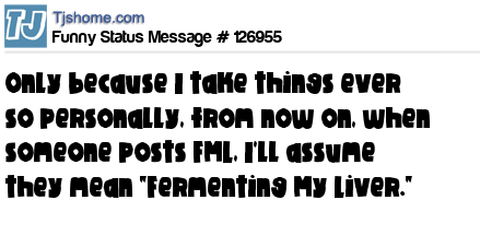 X Only because I take things ever so personally, from now on, when someone posts FML, I'll assume they mean "Fermenting My Liver."