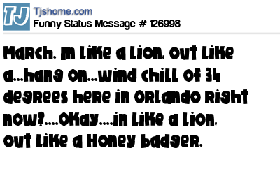 X March. In like a lion, out like a...hang on...wind chill of 34 degrees here in Orlando right now?....Okay....in like a lion, out like a Honey badger.