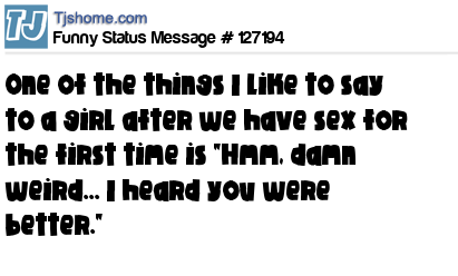 - # 101184 One of the things I like to say to a girl after we have sex for the first time is "Hmm, weird... I heard you were better."