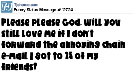 - # 12653 thinks God will still love me if I don't annoy 15 of my friends with some stupid chain email.