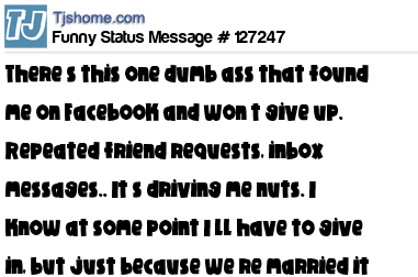 X There’s this one dumb ass that found me on Facebook and won’t give up. Repeated friend requests, inbox messages.. It’s driving me nuts. I know at some point I’ll have to give in, but just because we’re married it doesn't mean I have to like him,