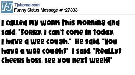 X is I called my work this morning and said, "Sorry, I can't come in today, I have a wee cough." He said, "You have a wee cough?" I said, "Really? Cheers boss, see you next week!"