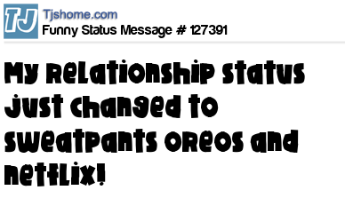 X says My relationship status just changed to sweatpants oreos and netflix!