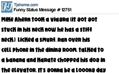 X says Mike Ahern took a viagra (it got got stuck in his neck now he has a stiff neck,) licked a smurf, ran over his cell phone in the dining room, talked to a banana and karate chopped his dog in the elevator. It's gonna be a looong day