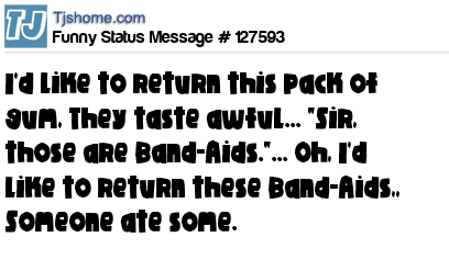 - # 136395 I'd like to return this pack of gum. They taste awful. "Sir, those are Band-Aids." Oh, I'd like to return these Band-Aids. Someone ate some.