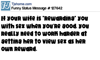 X says If your wife is "rewarding" you with sex when you're good, you really need to work harder at getting her to view sex as her own reward.