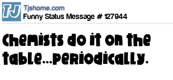 - # 157177 Chemists tell great joke, but they don't get a reaction because all their people skills Argon. OMG... that's Sodium funny, right? NA? Okay.
