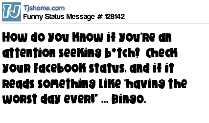 X How do you know if you're an attention seeking b*tch? Check your Facebook status, and if it reads something like 'having the worst day ever!" ... Bingo.