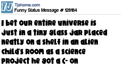 - # 210893 Our entire planet is probably in a tiny glass jar somewhere placed on a shelf in an alien student's classroom as a science fair project that got a C minus.
