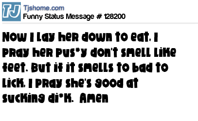 X  Now I lay her down to eat, I pray her pus*y don't smell like feet. But if it smells to bad to lick, I pray she's good at sucking di*k.  Amen