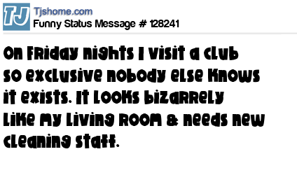 X says On Friday nights I visit a club so exclusive nobody else knows it exists. It looks bizarrely like my living room & needs new cleaning staff.