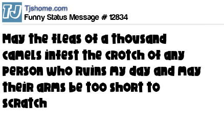 - # 142591 May the fleas of 1000 camels infest the crotch of the person who screws up your day and may their arms be too short to scratch it.