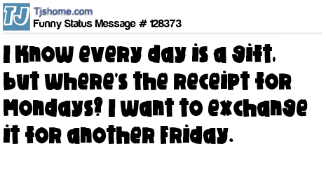 X says I know every day is a gift, but where's the receipt for Mondays? I want to exchange it for another Friday.