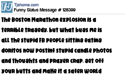 Other then that how is you day going ..did you hear about Boston and the explosions ..and have you heard tjshome has changed to a news feed and comment page for stupid people that don't have a life ..IT'S CALLED "Funny Status Message" NOT LETS WASTE THE DEVELOPERS TIME BY WRITING UNRELATED BS BECAUSE I DON'T HAVE A LIFE AND LIKE DISH IT ONTO EVERYONE ELSE!!!