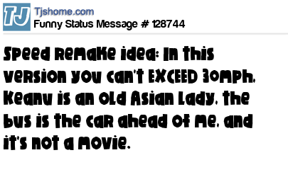 X Speed remake idea: In this version you can't EXCEED 30mph, Keanu is an old Asian lady, the bus is the car ahead of me, and it's not a movie.