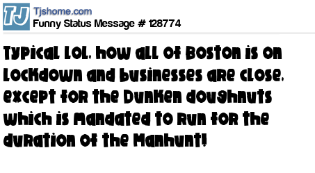 X Typical lol, how all of Boston is on lockdown and businesses are close, except for the Dunken doughnuts which is mandated to run for the duration of the Manhunt!