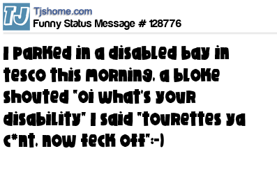 X is I parked in a disabled bay in tesco this morning, a bloke shouted "oi what's your disability" I said "tourettes ya c*nt, now feck off":-)