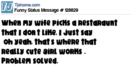 - # 185683 When my wife picks a restaurant that I don’t like, I just say “oh yeah, that’s where that really cute girl works”. Problem solved.