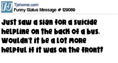 - # 76354 Today I saw a sign for a suicide helpline on the back of a bus. I couldn't help but think, it would work much better on the front.