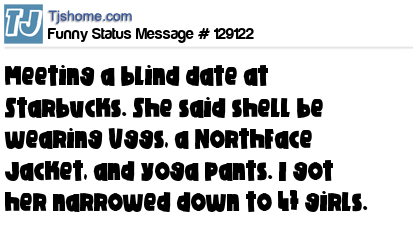 X Meeting a blind date at Starbucks. She said shell be wearing Uggs, a NorthFace Jacket, and yoga pants. I got her narrowed down to 47 girls.