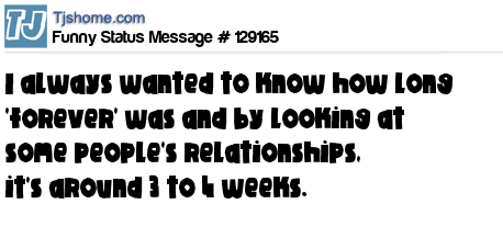 - # 102756 I've always wanted to know how long "forever" was... and by looking at some peoples relationships its around 2 to 4 weeks.