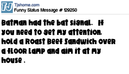 X says Batman had the bat signal. If you need to get my attention, hold a Roast Beef Sandwich over a floor lamp and aim it at my house .