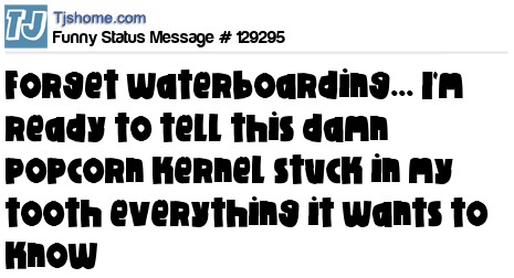 X Forget waterboarding... I'm ready to tell this damn popcorn kernel stuck in my tooth everything it wants to know