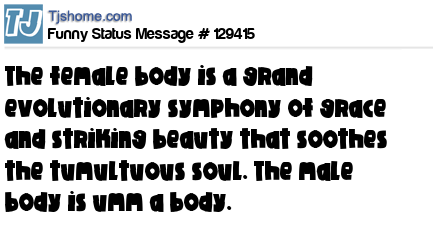 X says The female body is a grand evolutionary symphony of grace and striking beauty that soothes the tumultuous soul. The male body is umm a body.