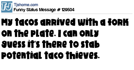 X says My tacos arrived with a fork on the plate. I can only guess it's there to stab potential taco thieves.