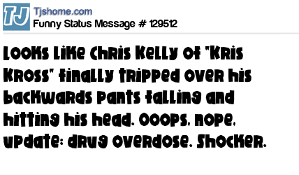 - # 129554 Oh no Chris from Kriss Kross died... You know the 90's rap duo that wore their clothes backwards.... I guess it's down to only Kross Dressing. That's wikkity wikkity wikkity wack!