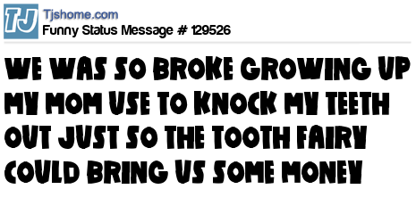 X WE WAS SO BROKE GROWING UP MY MOM USE TO KNOCK MY TEETH OUT JUST SO THE TOOTH FAIRY COULD BRING US SOME MONEY
