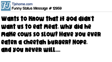 - # 13296 wants to know that if God didn't want us to eat meat, why did he make Cows so slow? Have you ever eaten a Cheetah burger? Nope, and you never will.... !!!!