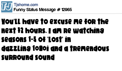 X  You'll have to excuse me for the next 72 hours. I am re watching seasons 1-5 of 'Lost' in dazzling 1080i and a tremendous surround sound