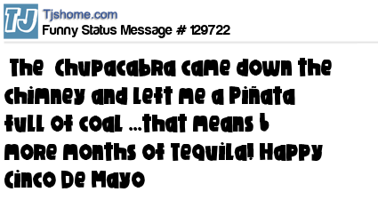 X The Chupacabra came down the chimney and left me a Piñata full of coal ...that means 6 more months of Tequila! Happy Cinco De Mayo