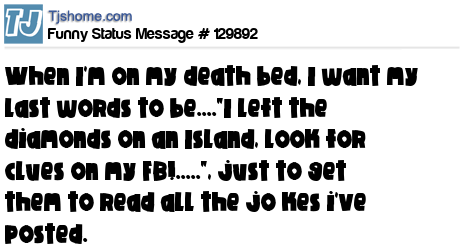 X  When I'm on my death bed, I want my last words to be...."I left the diamonds on an Island, look for clues on my FB!.....", just to get them to read all the jo kes i've posted.