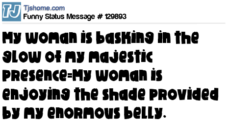 X My woman is basking in the glow of my majestic presence=My woman is enjoying the shade provided by my enormous belly.