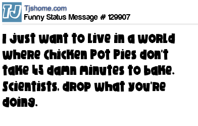 X I just want to live in a world where Chicken Pot Pies don't take 45 damn minutes to bake. Scientists, drop what you're doing.