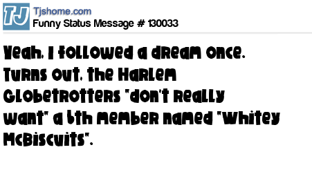 X Yeah, I followed a dream once. Turns out, the Harlem Globetrotters "don't really want" a 6th member named "Whitey McBiscuits".