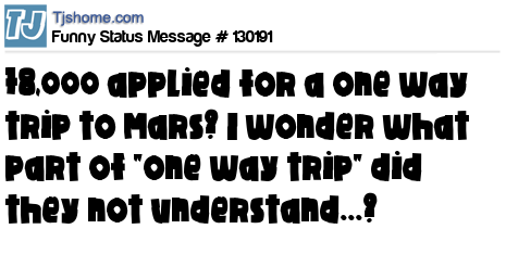 - # 130182 So 78,000 people applied for a one way trip to Mars huh? Hopefully they were all members of congress...