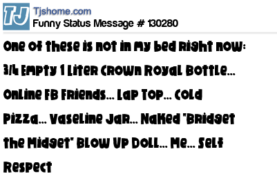 X is One of these is not in my bed right now: 3/4 Empty 1 Liter Crown Royal Bottle... Online FB Friends... Lap Top... Cold Pizza... Vaseline Jar... Naked "Bridget the Midget" Blow Up Doll... Me... Self Respect